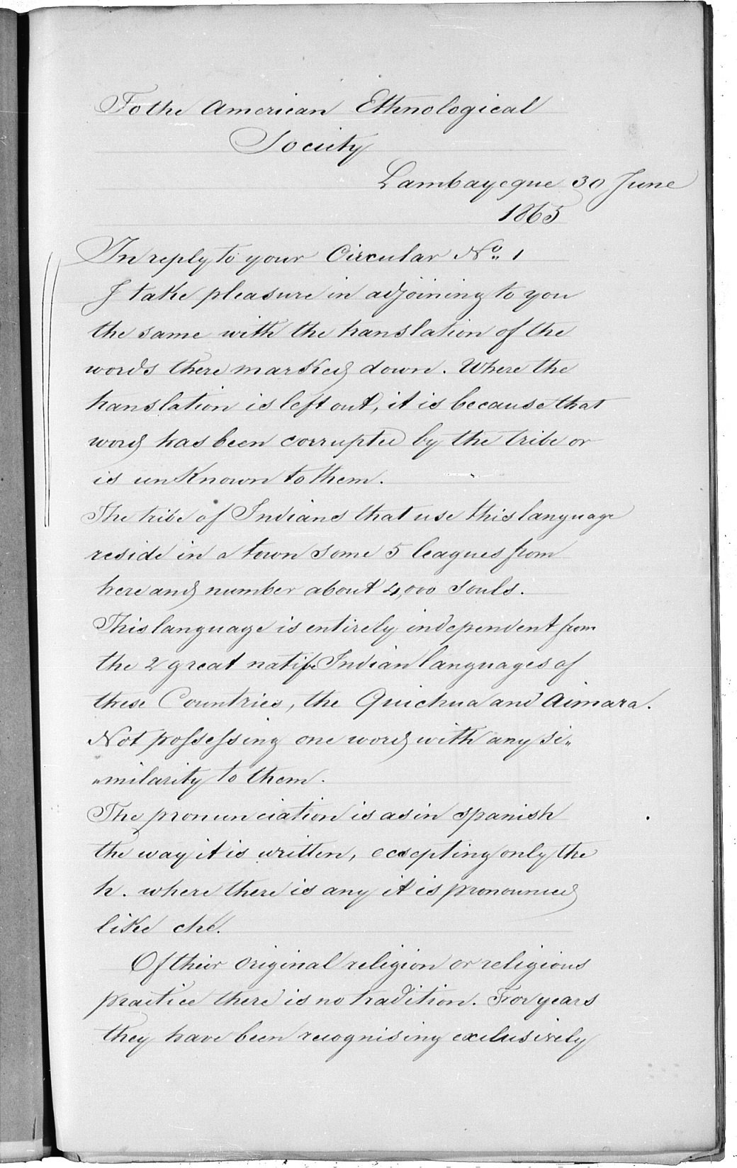 Abstract: This article provides a list of 125 words of the Mochica language. Created in 1865 on the initiative of Santiago C. Montjoy, then United States consul in Lambayeque, the list was discovered in the 1970s among the dispatches of the Lambayecan consuls, which are archived in the National Archives of the United States by archeologist James B. Richardson III. The list responds to a call from the American Ethnological Society, which, in its first circular that was issued in 1863, invited respondents to submit the equivalents of 180 English words in the indigenous languages of the Americas. This article discusses the circumstances of the elaboration of the list and presents a transcription of its contents and associated materials. In addition, it provides a comparison of the words with their representation in other sources and a philological analysis of selected aspects of the material. In spite of the unsystematic orthography, which one usually finds in this type of source, the wordlist offers new interpretative avenues regarding the phonetics and phonology of 19th century Mochica and the possibility of deepening our understanding of the language.