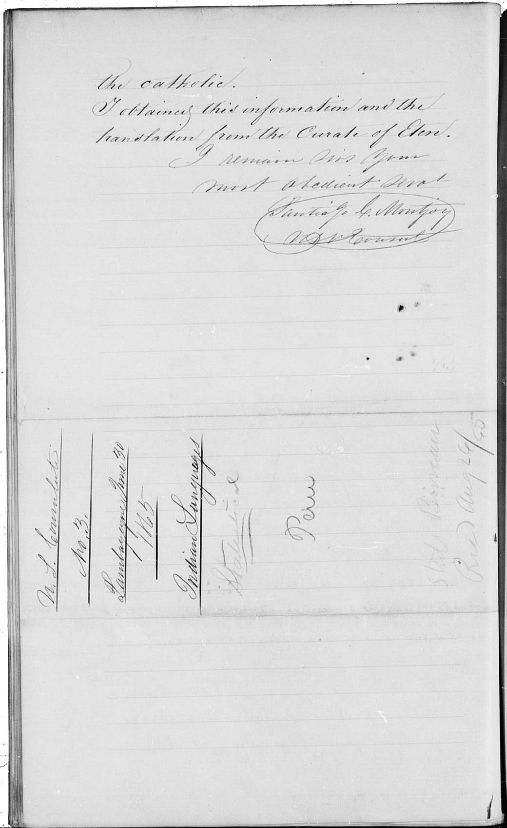 Entre la correspondencia de Montjoy también se halla una carta al secretario de Estado estadounidense William H. Seward, fechada el 27 de julio de 1865, en la que Montjoy menciona que adjunta «una circular No 1 de la American Ethnological Society sobre lenguas indígenas» y que ha conseguido «por medio del cura de este pueblo, una lista lo más completa como sea posible».
