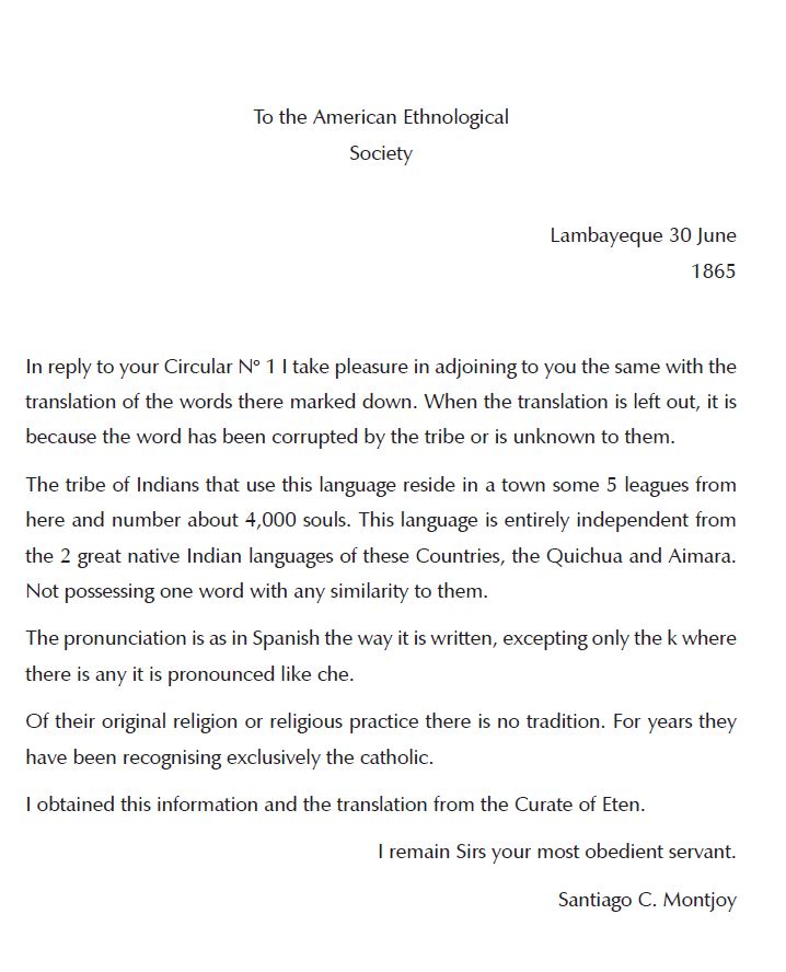 Es de suponer que se trata de la lista Montjoy dado que Squier, en una reunión de la Sociedad que tuvo lugar en junio de 1861, presentó una carta del diplomático norteamericano P. Randolph Clay y un vocabulario acompañante que Clay, según el protocolo de la reunión (Anónimo, 1861), supuestamente había procurado de los moradores de Eten. La conjetura de que no se trata de otro documento más que de la lista Montjoy se ve reforzada por el hecho de que, en su carta, Clay indica que no conoce la ubicación exacta de Eten más allá de que se ubica cerca de Lambayeque y dice explícitamente que personalmente nunca ha visto ni a uno solo de sus moradores y que toda información relacionada fue obtenida de oídas. Como ya había notado en Urban (2019: 150fn146), esto sugiere que otra persona proporcionó la lista —como se puede suponer ahora, Montjoy, o, más precisamente, el cura de Eten por iniciativa de Montjoy—.