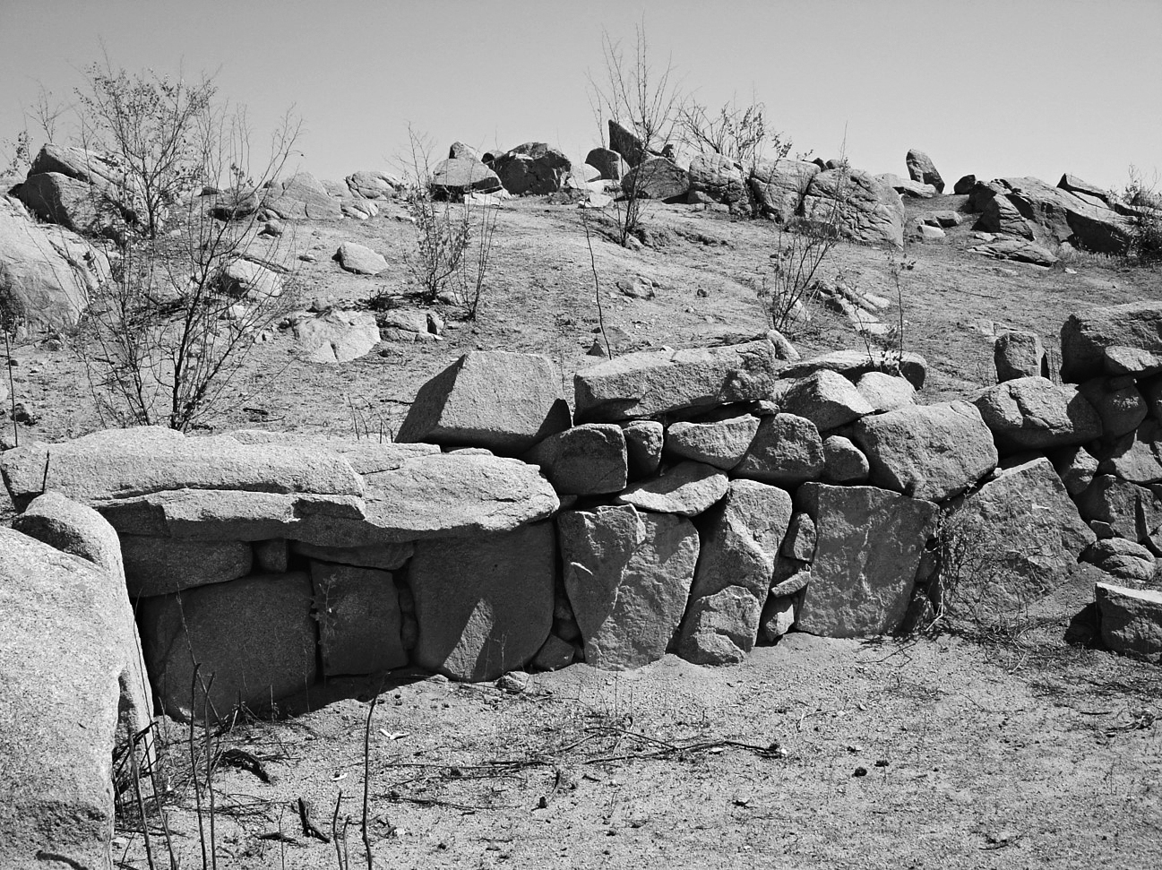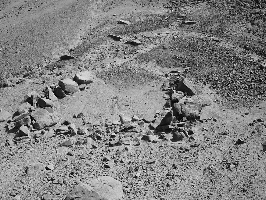 No quiero dejar de anotar la hermosura de las estructuras megalíticas bajo el roquedal. El conjunto revela adscripción al paisaje, fuerza y belleza. Algunos paramentos megalíticos han sido construidos con afán de perfección. La magnitud de las jambas impresiona. Parte del material constructivo está constituido por sólidas piedras redondeadas y suavizadas por la intemperie, las que aún se muestran en esta y en otras cimas y cumbres circundantes. Finalmente quiero indicar el grado de preservación de estos elementos arqueológicos. A pesar de su inherente fragilidad, muchos de los restos se hallan bien conservados, en algunos casos intactos, gracias a que el río no ha permitido el desarrollo de poblados y de fincas agrícolas, y al escaso tránsito al que el recorrido está sujeto. Sin embargo, vemos con suma preocupación la reciente instalación de granjas para aves y una mina; las primeras de las cuales se han emplazado en espacios ocupados por algunos geoglifos.