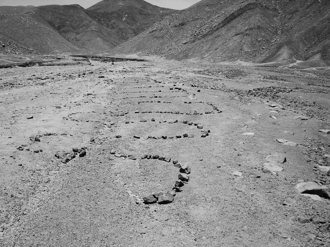 Específicamente hemos hallado geoglifos y alineaciones de piedras. Los geoglifos, la mayoría de los cuales son de trazo geométrico, algunos con una longitud que excede el centenar de metros, presentan variadas disposiciones y técnicas de factura. En el conjunto sobresale un campo de rayas magníficamente preservado y de posible significado calendárico dado el espaciamiento variable de las líneas y su orientación al levante. Se relaciona con una figura serpentiforme y con otra que esquematiza la planta de los mentados templos con forma de U. También son relevantes un sinnúmero de alineaciones de piedras. Al parecer, predominan las que apuntan a quebradas y cauces asociándolas con los eventuales torrentes de agua. Es de mencionar el excepcional hallazgo de una gran línea con multitud de cántaros de la cultura lima (Blanco sobre Rojo) ritualmente quebrados. Maravilla que milenios después estos recipientes se conserven, partidos pero intactos, como si acabaran de ser arrojados contra el suelo. Grandes piedras, blancas, negras y rojizas, redondeadas por la erosión, determinan un paraje de insólita hermosura. Tres geoglifos ejecutados sobre una superficie enrojecida signan el emplazamiento sagrado. El de forma zigzagueante evoca la andadura de la serpiente, el rayo, el río: poderosos símbolos ligados con la actividad pluviomágica.