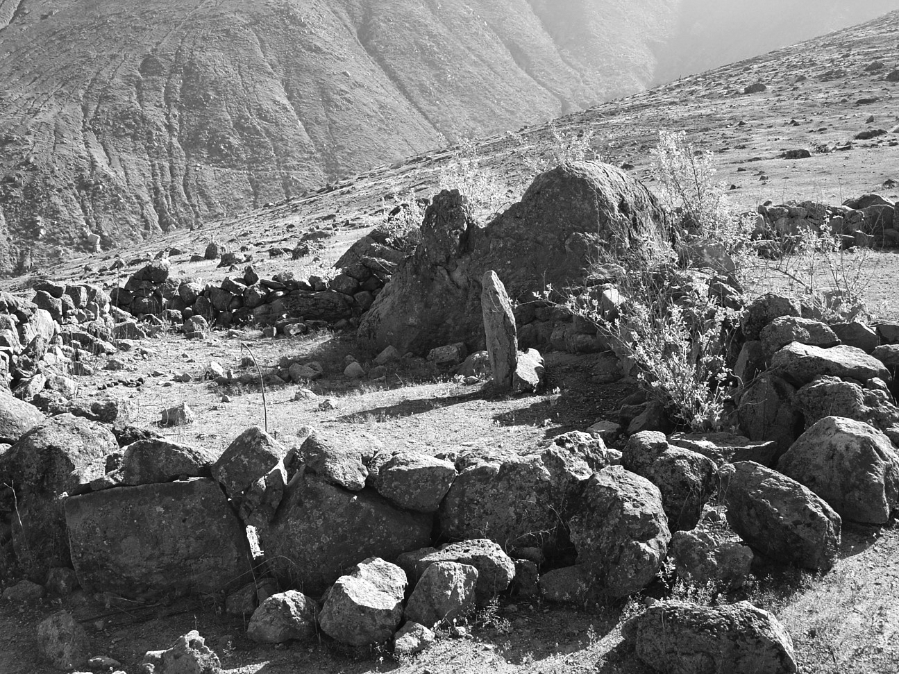- Estructuras habitacionales: los restos arquitectónicos mayores de la quebrada Tinajas corresponden a recintos (a veces aterrazados) de piedra seca que formaban probablemente estructuras habitacionales y corrales (figs. 4 y 5). Su forma y extensión eran variables y sus muros, que rara vez superan los 60 cm de altura, se encuentran a menudo construidos sobre afloramientos y adosados a rocas macizas. Estos recintos podrían ofrecer un potencial estratigráfico para la excavación arqueológica, con vistas a la producción de conocimientos sobre la historia cultural de la cuenca de Lurín.