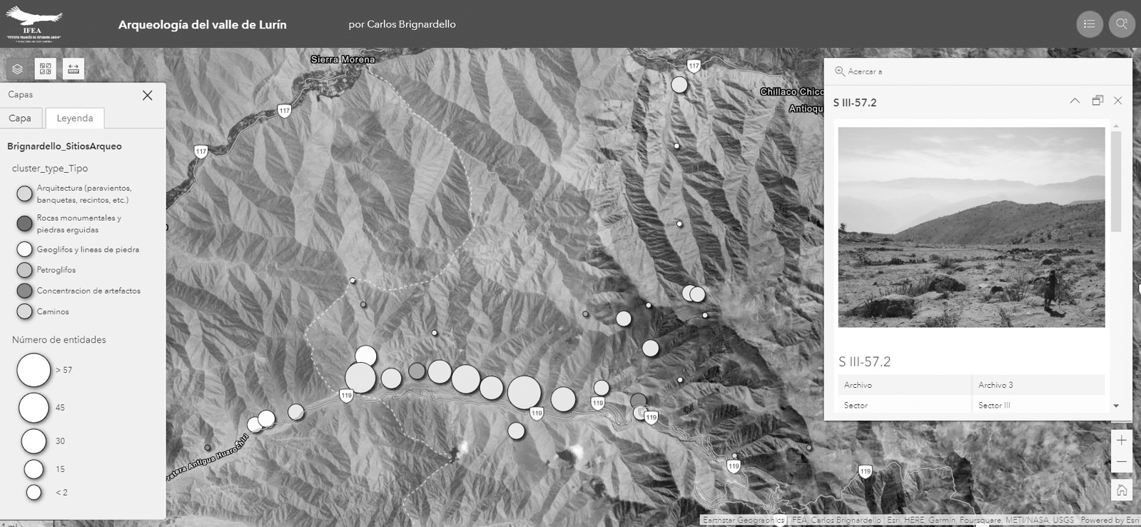 Cada punto del mapa representa un sitio, es decir una concentración de restos arquitectónicos y/o de artefactos arqueológicos. La pestaña «leyenda», situada en la parte superior derecha del mapa, permite visualizar estos sitios por categorías, las cuales distinguen: estructuras arquitectónicas, rocas monumentales y piedras erguidas, geoglifos y alineaciones de piedras, petroglifos, concentraciones de artefactos y vías. El tamaño de cada punto representa la densidad de sitios (que un zoom permite discretizar). Dar un clic en cada punto permite acceder a una ficha de descripción con los datos y fotografías registrados y tomados por el mismo Brignardello. Un motor de búsqueda (el botón lupa) permite la consulta directa de datos específicos del registro. Finalmente, una capa del Sistema de Información Geográfica de Arqueología del Ministerio de Cultura del Perú (https://sigda.cultura.gob.pe/) y otra de la topografía del Instituto Geográfico Nacional permiten visualizar la información oficial para la misma región.