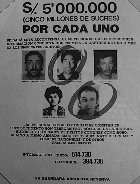 Además, hay muchas diferencias conceptuales y programáticas, así como en los métodos utilizados, entre los grupos subversivos ecuatoriales y peruanos, ya que solo estos últimos atentaron directamente contra la población civil. De manera específica se puede decir que el PCP-SL «(…) fue un movimiento poco comparable a otros grupos subversivos latinoamericanos por su ideología totalitaria, justificó el hecho de declarar la guerra a todos los otros sectores políticos, incluidos los de la izquierda marxista, por el solo hecho de participar en un escenario legal que era, en 1980 en el Perú, totalmente abierto» (IIDH, 2005: 205). En el Ecuador, AVC proclamaba reivindicaciones propias de las facciones de izquierda en contra del capitalismo, pero a diferencia del Perú, estas reivindicaciones políticas de la izquierda ecuatoriana se encontraban vinculadas a un pensamiento predominantemente marxista. Las unidades clandestinas del Estado antes mencionadas —el Servicio de Investigación Criminal y Contrainteligencia Quito— habrían planificado operaciones de recompensa para su ubicación, captura, neutralización y eliminación. La figura 5 es un afiche de recompensa por la captura de miembros del grupo AVC, en el que se señala quiénes fueron «eliminados» por miembros de las fuerzas de seguridad del Estado. En ambos países, AVC y el PCP-SL eran el objetivo de la lucha antisubversiva de las Doctrinas de Seguridad Nacional. Cabe resaltar que las coordinaciones entre ambos Estados se han hecho evidentes gracias a la información desclasificada sobre los procesos subversivos del PCP-SL que se recopilan en Ecuador, producto de allanamientos a los archivos de las dependencias de la Policía Nacional ecuatoriana.