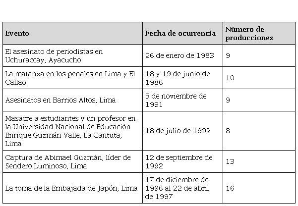 Una de las conclusiones más interesantes y visibles de nuestro proyecto de investigación ha sido constatar que hay ciertos eventos más representados que otros. Por ejemplo, sucesos ocurridos en Lima como el caso de la Cantuta, la toma de la embajada de Japón o la captura de Abimael Guzmán tendrán más filmes, en detrimento de otras regiones, como la Amazonía, que sigue siendo poco representada en las producciones audiovisuales. Esto genera tensiones y es muestra de las pulsiones sobre cómo opera la memoria, guardando relación con lo señalado por Paloma Aguilar (2002). El cine es parte de estas batallas.