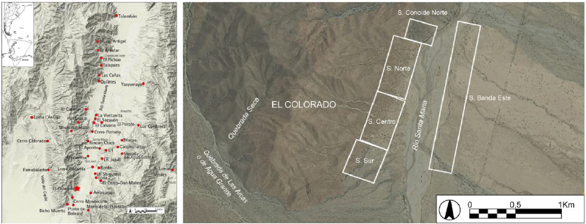 Las principales evidencias de instalaciones en la localidad corresponden a diferentes momentos históricos, desde el Formativo hasta la actualidad, registrándose reutilizaciones de varios espacios a lo largo del tiempo, debido a lo cual el criterio empleado para definir sus límites y proponer una sectorización interna se basó, en esta instancia, en las variaciones topográficas. La terraza fluvial y la ladera baja son las zonas más modificadas por la ocupación humana con amplios espacios despedrados y desmontados para la construcción de recintos y la agricultura. Se detectaron también estructuras en el cono aluvial ubicado al norte y en la margen derecha del río. Hemos establecido entonces de modo arbitrario los límites de la localidad arqueológica considerando los extremos norte y sur del cerro, entre O 26°55'26.27" y S 26°54'5.33"S. En sentido este – oeste el límite se definió en función de la detección de evidencias arqueológicas y comprende en su lado occidental el espacio entre la ladera baja del cerro y el río Santa María, y en su lado oriental una franja de 250 metros de la terraza que costea el río en toda su extensión frente al cerro Colorado.