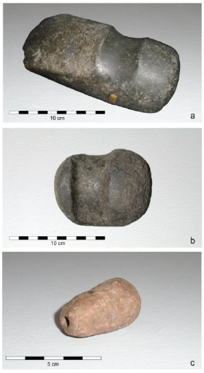 Objetos con proveniencia del Cerro Colorado adquiridos por Debenedetti. a) 27194 Hacha de piedra; b) 27195 Martillo de piedra; c) 27196 Silbato de barro cocido. Depósito de Arqueología, Museo Etnográfico “Juan B. Ambrosetti”.