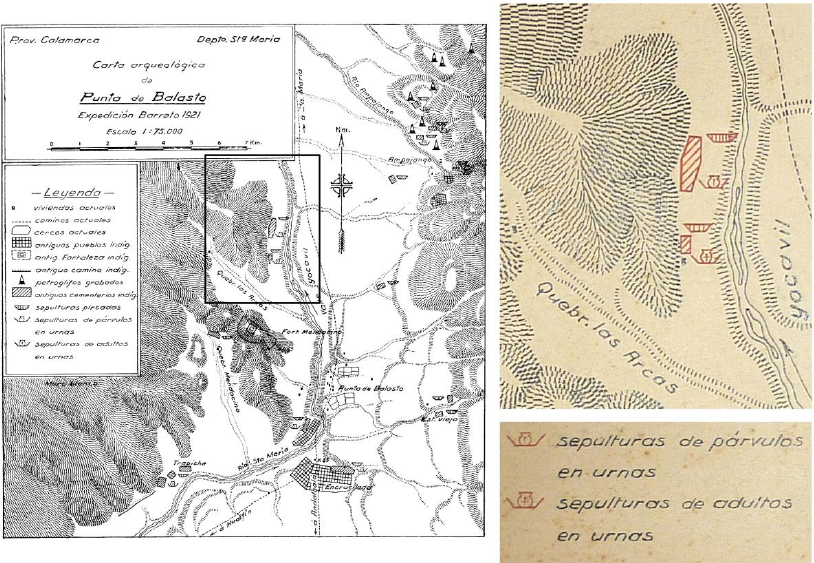 Entre el 4 de octubre de 1920 y el 28 de mayo de 1921 se llevó a cabo la Tercera Expedición Arqueológica al Noroeste Argentino organizada de manera privada por Benjamín Muñiz Barreto. El objetivo principal de esta expedición era conformar una gran colección de objetos arqueológicos compuesta por hallazgos bien preservados -se priorizaba la recuperación de objetos enteros o muy completos-, y debidamente documentados, de acuerdo con los estándares metodológicos del momento. Los trabajos en Yocavil, que estuvieron a cargo de Vladimiro Weiser con la asesoría de Salvador Debenedetti, se concentraron en esa oportunidad en el sur y centro de Yocavil. Se establecieron campamentos en las zonas de Punta de Balasto, Ampajango, Santa María, Puesto El Molino, Caspinchango y El Bañado. En base a la documentación de este viaje se elaboraron las cartas arqueológicas de Quilmes y Bañado, y de Punta de Balasto (Figura 3), publicadas por Márquez Miranda[11]. Un detalle de la última carta fue publicado con modificaciones por Carrara et al. 1960[12].