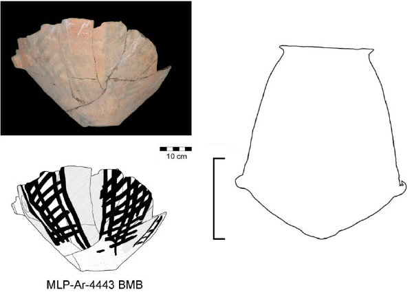 Tinaja MLP-Ar-4443 BMB, del Museo de La Plata, recuperada por Weiser en el cementerio “Cerro Colorado I”, en el Sector Centro. En un perfil tentativo de la pieza se indica el segmento que representa el fragmento conservado.