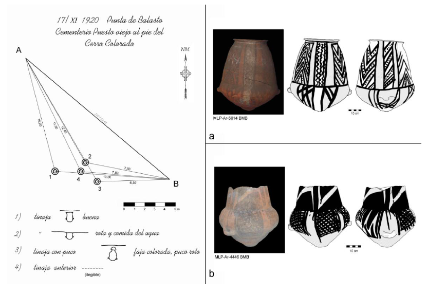Recomposición del croquis de campo del “Cementerio Puesto viejo al pie del Cerro Colorado” o “Cementerio II”, ubicado en el Sector Norte, en base a la Libreta 16, pp. 19 de Weiser (1920-1921). a y b: tinajas MLP-Ar-5014 BMB y MLP-Ar-4446 BMB, del Museo de La Plata, recuperadas por Weiser en “Cementerio Puesto viejo al pie del Cerro Colorado” o “Cementerio II”.