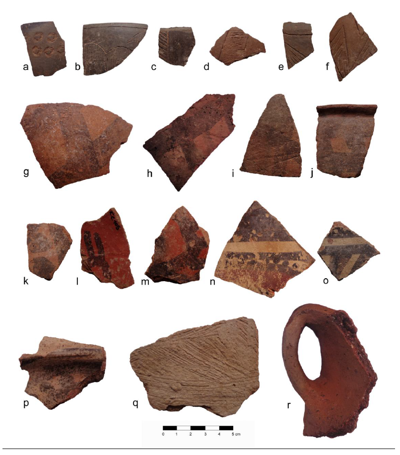 a-f: cerámica formativa gris pulido y ante pulido con diseños incisos. g-k: cerámica tardía San José. l-m: cerámica tardía Loma Rica. n-p: cerámica tardía Santa María. q: cerámica tardía ordinaria peinada. r: cerámica subactual ordinaria alisada.
