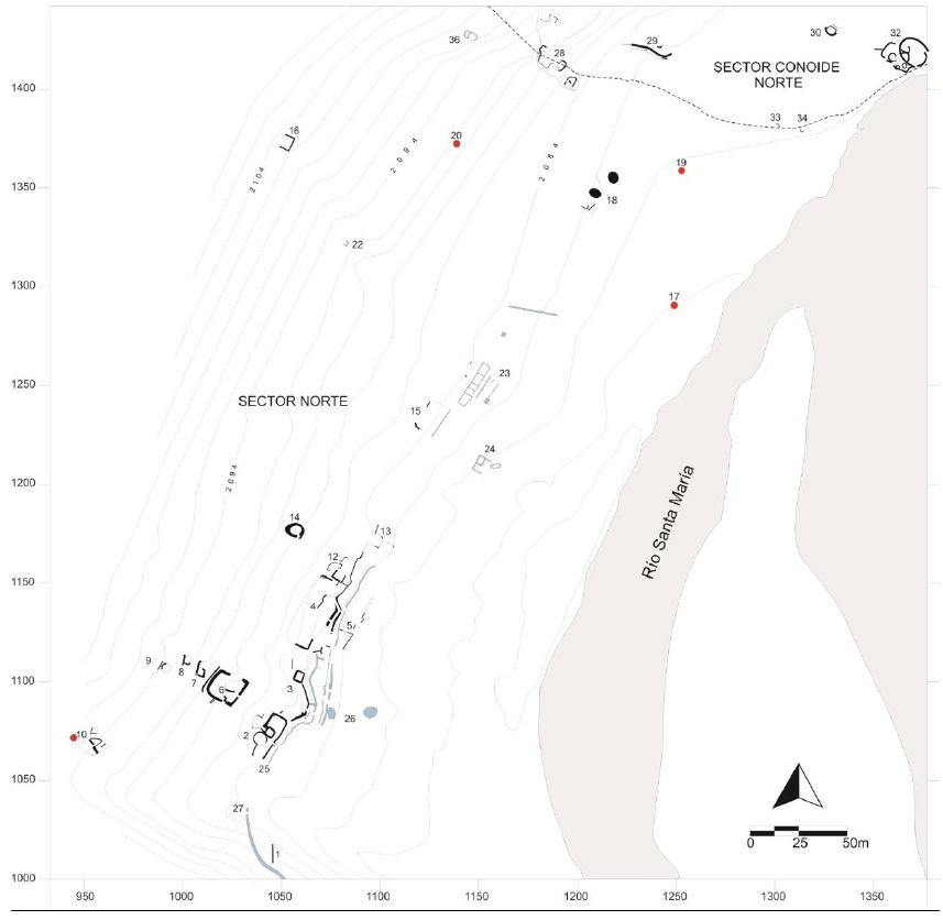 Finalmente se seleccionó el área norte de la localidad (Sectores Norte y Conoide Norte) para el levantamiento de planimetría con estación total (Trimble 3605 DR). La elección de la zona se basó en la abundancia y diversidad funcional y cronológica de las detecciones realizadas. Esta primera planimetría de la localidad permite exponer visualmente la complejidad del registro arquitectónico superficial en relación a la situación topográfica de las estructuras y la contigüidad y yuxtaposición espacial de rasgos de diferentes épocas.
