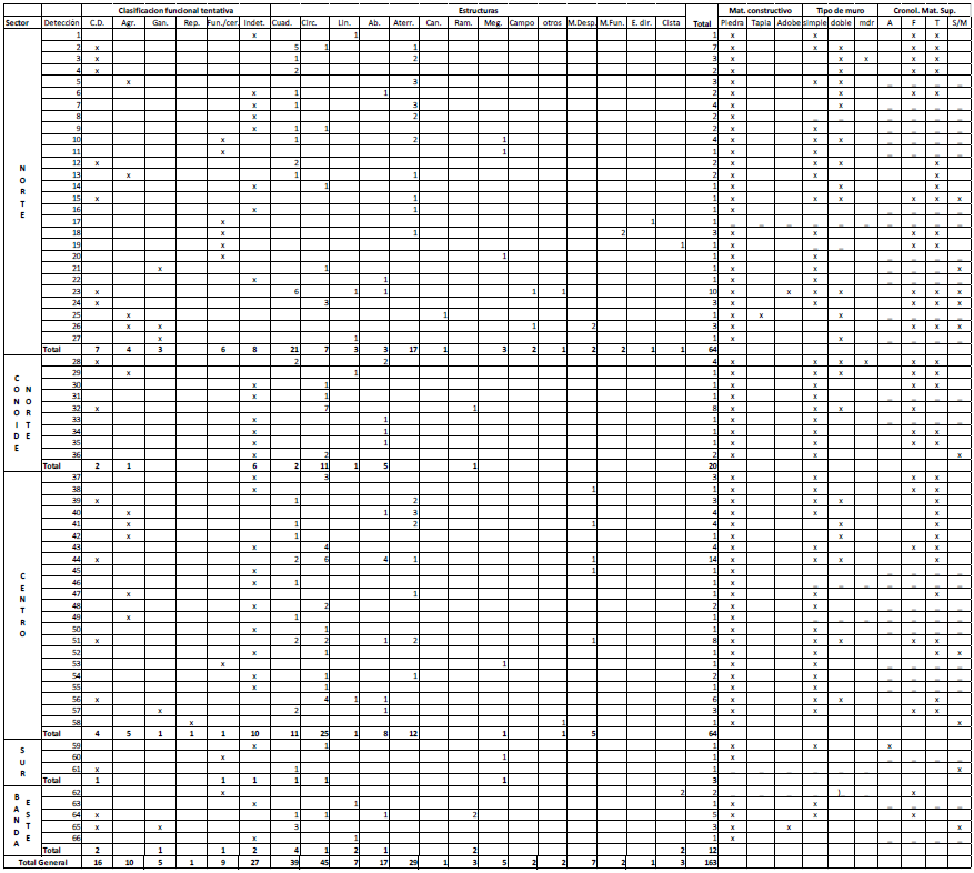 Referencias: C.D.: complejo doméstico, Agr.: agricultura, Gan.: ganadería, Rep.: reparo, Fun./Cer.: funerario/ceremonial, Indet.: indeterminado. Cuad.: cuadrangular, Circ: circular, Lin.: lineal, Ab.: abierto, Aterr.: aterrazado, Can.: canal, Ram.: rampa, Meg.: megalito, M.Desp.: montículo despedre, M.Fun: montículo funerario, E.Dir: entierro directo, mdr: muro doble con relleno. A: arcaico, F: formativo, T: tardío, S/M: subactual/moderno.