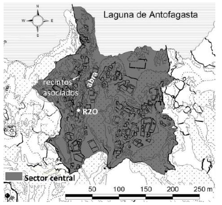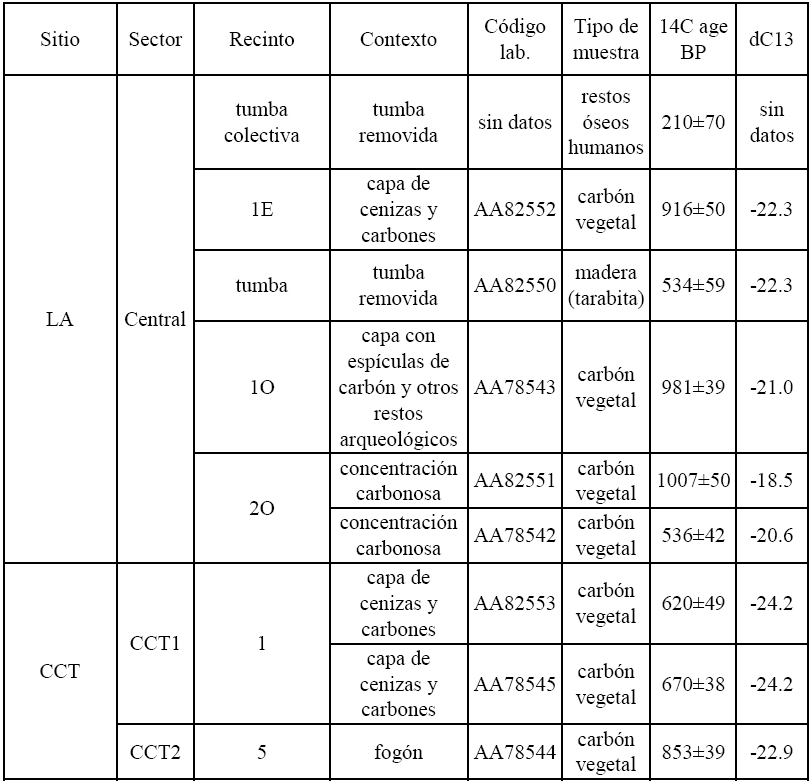LA es un sitio de amplias dimensiones, compuesto por una gran diversidad de estructuras dispuestas sobre las coladas del volcán Antofagasta, a aproximadamente 5-6 km al sur del poblado actual (figuras 1 y 2). Diversas evidencias apoyan su ocupación fundamentalmente durante los períodos de Desarrollos Regionales, Inka e Histórico, con elementos que la relacionan al sistema cultural Belén de los valles de Abaucán y Hualfín. Suponíamos que la ocupación del sitio se habría dado hacia ca. 700 años AP, pero fechados radiocarbónicos recientes la profundizaron, sin descartar el posterior desarrollo como conglomerado del sitio (tabla 1)13. Luego de ca. 700 años AP, LA habría devenido en un gran centro habitacional, políticamente relevante en la cuenca, y en un nodo/centro de intercambio y almacenamiento al que habrían estado estrechamente vinculados otros asentamientos14. Uno de ellos es BCII, posiblemente abandonado como área habitacional y ocupado como zona productiva agrícola, incluso en momentos posteriores al arribo inkaico. En este sentido, se han señalado diferencias entre los conjuntos cerámicos de superficie relevados en este sitio (asociados a su última ocupación) y los procedentes de LA. En los primeros predominan tiestos potencialmente relacionados por sus propiedades físico-mecánicas a actividades de almacenaje y/o procesamiento de productos secos, mientras que los asociados a actividades culinarias están escasamente presentes. En LA, en tanto, los tiestos potencialmente destinados a actividades de almacenaje y/o procesamiento, también con considerable presencia, registran mayor variabilidad en sus características físico-mecánicas y aquellos asociados a tareas de cocción evidencian frecuencias más elevadas. Estas tendencias han sido explicadas en términos de la ocupación habitacional de este último sitio y el desarrollo en él de un amplio rango de actividades15.