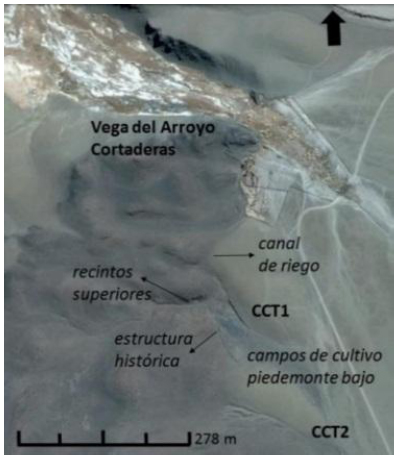 Otro asentamiento vinculado a LA es CCT. Se encuentra a aproximadamente 15 km al noroeste del poblado actual, en el curso medio del río Mojones. Este corresponde a los sectores intermedios, aunque presenta una topografía más abierta que sus semejantes de Las Pitas, Miriguaca y Curuto (figura 1). El registro de cerámica estilo Belén y Belén-Inka y los fechados radiocarbónicos disponibles permiten preliminarmente señalar su ocupación luego de ca. 800/700 años AP y hasta momentos inkaicos (tabla 1). La presencia de recintos, aterrazados, cuadros de cultivo y vestigios de una acequia o canal de riego prehispánico (figura 3), el predominio de fragmentos cerámicos potencialmente asociados a actividades de almacenaje y/o procesamiento de productos secos y la muy baja presencia de tiestos relacionados a actividades culinarias han llevado a proponer similitudes entre CCT y la última ocupación de BCII. En base a estas tendencias, se sugirió que CCT también constituyo un área especializada en actividades agrícolas, relacionada a LA y ocupada en forma temporaria durante el ciclo productivo (considerando su distancia al conglomerado del fondo de cuenca)16.