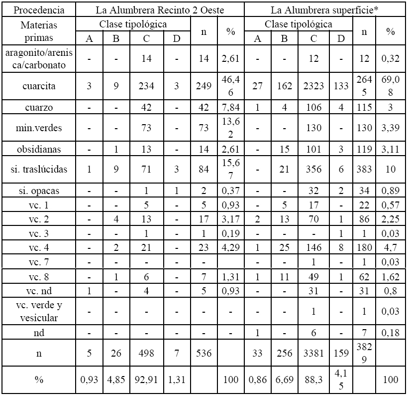 Los desechos concentran elevadas frecuencias tanto en R2O como en superficie. Interesa resaltar que en ambos casos, aunque con diferencias porcentuales, las sílices traslúcidas y los minerales verdes se encuentran entre las variedades mayormente representadas en esta clase tipológica (tabla 2).