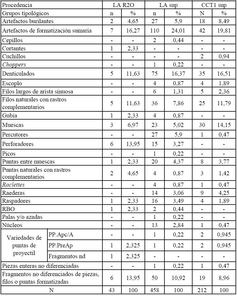 Tanto los conjuntos artefactuales de R1 como los de superficie se hallan compuestos por artefactos formatizados, artefactos con filos, puntas y/o superficies con rastros complementarios, desechos y escasos núcleos (tabla 5). Las dos primeras clases tipológicas representan el 4,95% en la muestra estratigráfica y el 8,43% en la de superficie. En R1 se relevaron un artefacto sin manufactura con filos, puntas y/o superficies con rastros complementarios y cuatro artefactos formatizados, identificándose en ellos nueve filos asignables a cinco grupos tipológicos (punta entre muescas, artefacto burilante, escoplo, artefactos de formatización sumaria, filo natural con rastros complementarios, fragmento no diferenciado de filo o punta formatizada y pieza entera no diferenciada). En tanto, entre los 141 artefactos relevados en superficie correspondientes a estas clases tipológicas, se contabilizaron un total de 212 filos, aristas y/o superficies y 16 grupos tipológicos. Dos puntas de proyectil y dos preformas fueron registradas, todas sin pedúnculo y con bases escotadas, manufacturadas en obsidiana Ona y Cueros de Purulla. En ninguno de los conjuntos artefactuales de CCT1 considerados, se relevaron perforadores, palas y/o azadas ni artefactos de molienda (tabla 3). Sin embargo, cabe mencionar que fueron identificados dos ejemplares de palas y/o azadas en vulcanita 8 en superficie en otro sector del asentamiento y, aunque no incorporados en la tabla, cuatro artefactos de molienda pasivos en las cercanías de los recintos septentrionales y de R151.