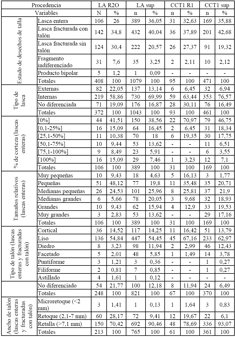 Las lascas fracturadas son dominantes en la muestra de desechos de talla de superficie de CCT1 (n=471), mientras que las enteras presentan menores frecuencias y los fragmentos indiferenciados concentran el 10%. Sobresalen las lascas internas (77%; n=461) y entre ellas las angulares, en tanto que las externas no llegan a conformar el 7%. Las lascas sin corteza representan el 47% de las enteras (n=169), mientras que aquellas con más del 50% de este atributo constituyen el 18%. En lo que refiere a los tamaños relativos, las lascas medianas pequeñas son las más numerosas, seguidas inmediatamente por las pequeñas, grandes, medianas grandes y muy grandes; las muy pequeñas hallan bajísima representación. Finalmente, entre los talones dominan los lisos, seguidos lejanamente por los corticales y diedros (n=370), y sobresalen ampliamente los asignables a retalla, mientras que los correspondientes a retoque presentan bajos porcentajes (n=361). Como ocurre en todas las muestras consideradas las lascas con talones asignables a microrretoque están casi ausentes (tabla 4).