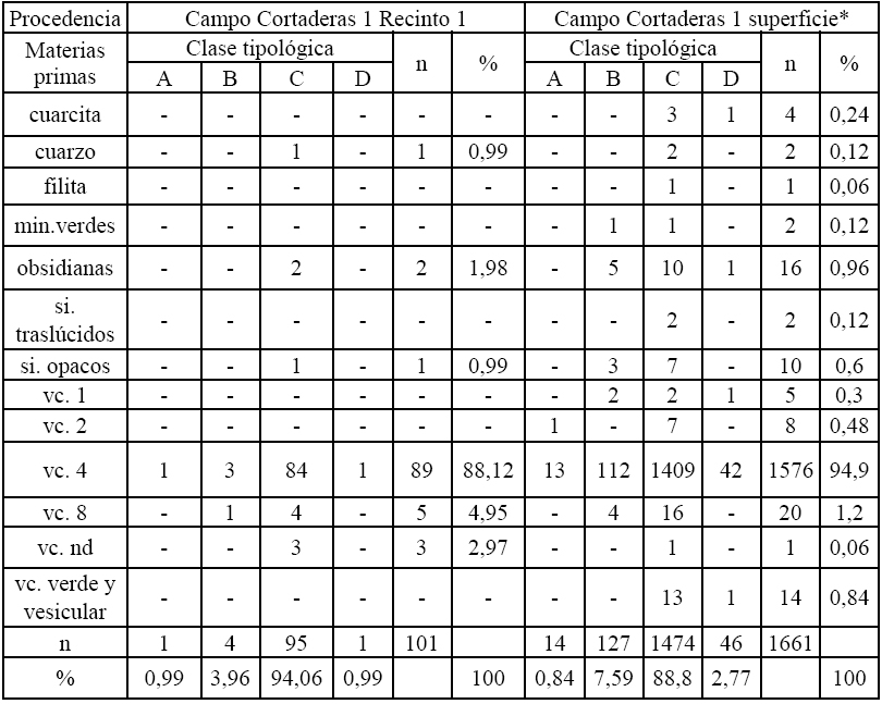 Entre los conjuntos de estratigrafía (n=101) y de superficie (n=1661) de CCT1 se identificaron 15 rocas y minerales y el predominio de una vulcanita similar a la 4 con un porcentaje promedio de 91,51% (tabla 5). Como adelantamos, probablemente los habitantes de CCT obtuvieron esta roca, en función de su proximidad, en los afloramientos de edad Pleistocena media (Formación Inkahuasi Fase I) y depósitos coluviales secundarios que se encuentran a lo largo de las abras en las cuales se emplaza el asentamiento49. Otras variedades disponibles inmediatamente en el área de CCT son la vulcanita 850, el cuarzo y las vulcanitas verde y vesicular (las dos últimas sólo registradas en las muestras de superficie), siendo la primera la más representada – R1: 4,95%; superficie: 1,2%- (tabla 5).