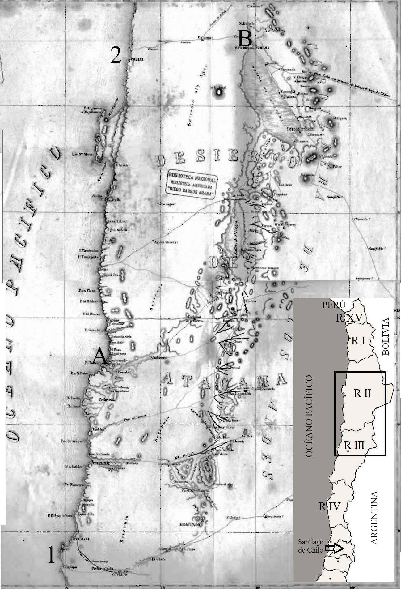 Junto a Philippi participaron del viaje Guillermo Doll, “ingeniero geómetro” que levantó el plano que se reproduce en este artículo, y dos “criados”: Domingo Morales y Carlos Núñez. Entre el instrumental se contaban “un mapa manuscrito hecho por el señor Navarrete” que se demostró inexacto en muchos aspectos, un barómetro, un psicrómetro, un sextante, un horizonte artificial y un cronómetro común de buque38. Fue preciso esperar a llegar al norte para averiguar cómo atravesar el desierto de oeste a este, pues en Santiago no existía información precisa. Los víveres se compraron en Valparaíso, donde los viajantes se embarcaron hasta Coquimbo y, luego de algunos días, desembarcaron en La Caldera desde donde llegaron en ferrocarril a Copiapó. Los expedicionarios se encontraban allí en el límite septentrional de Chile. En esta ciudad contrataron a un baqueano, Diego de Almeida, un minero anciano que antiguamente había hecho la travesía a San Pedro y con el que programaron la compra de mulas, medio de transporte insustituible por ser el camino en subida.