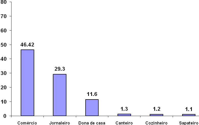 De los gallegos que vivieron en el barrio de Santo Antônio, la mayoría de ellos trabajó en el comercio (67,2%). No tenemos cómo comprobar en qué tipo de comercio, ya que prevalecen las definiciones de carácter más general, como “negociantes” y “empleados”. Sin embargo, nos arriesgamos a vincular la profesión de los emigrantes con el sector de la hotelería, no sólo por las declaraciones de los entrevistados, sino también por las características del propio barrio, dotado de restaurantes y pensiones. Esto no excluye, por supuesto, el comercio minorista.