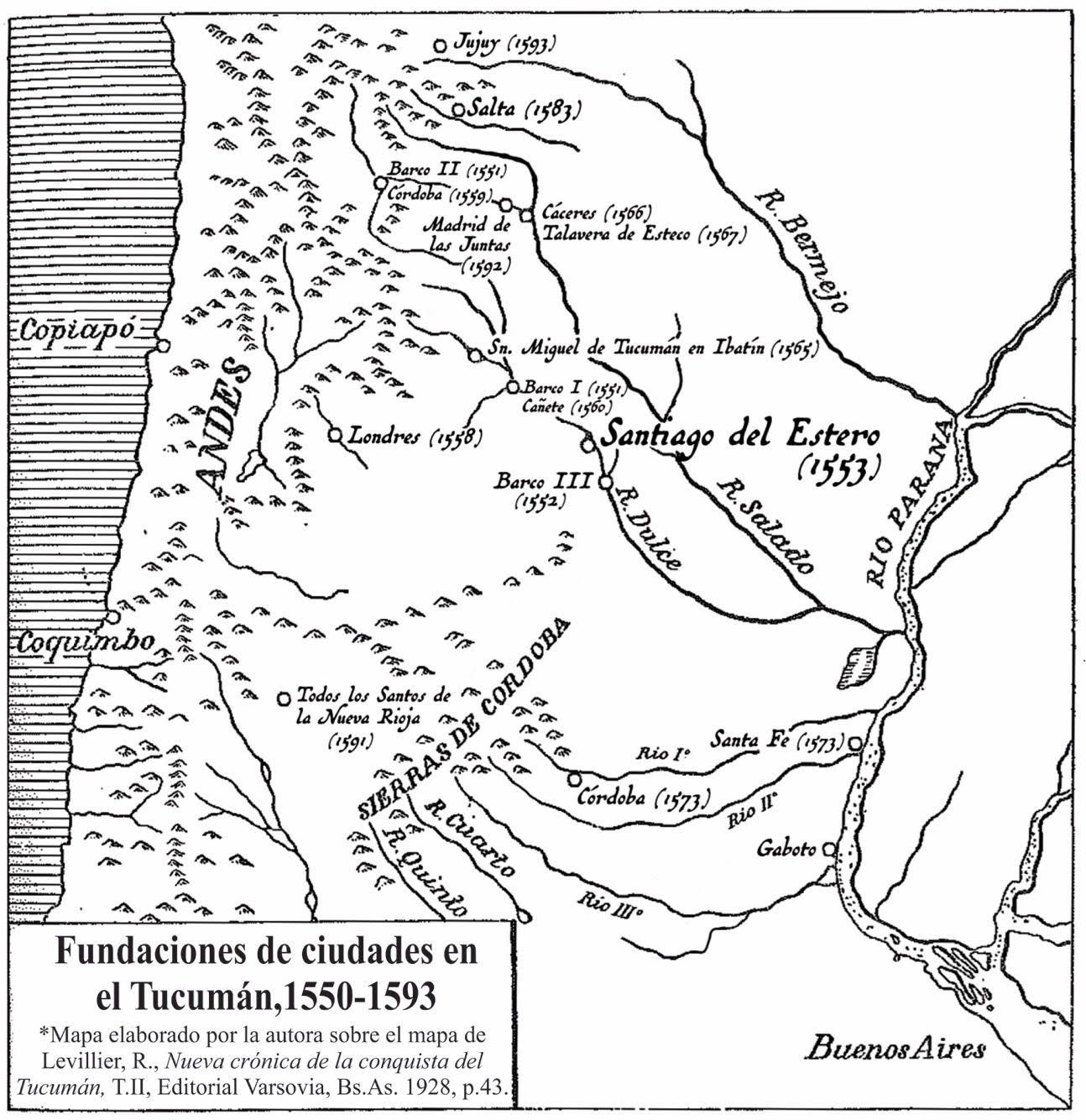 De acuerdo con Silvia Palomeque[22], a partir de ese momento se dan numerosos intentos de fundaciones que finalmente logran concretarse con Santiago del Estero en 1553, con la presencia de indios amigos, a la vez que se mantenían hostiles los indios de las llamadas tierras altas -Valles Calchaquíes y de Puna-.A partir de este momento, Santiago del Estero funcionará como cabecera de la futura Gobernación, y desde ella partirán gran parte de las jornadas que mantendrán a nuestros casos de análisis en constante movimiento. Estos intentos fundacionales no se vieron exentos de conflictos entre las huestes provenientes tanto desde Charcas como desde Chile[23].