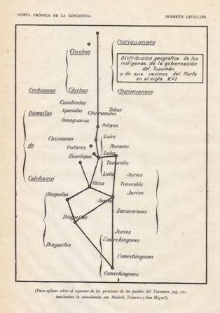 El trabajo pionero de Roberto Levillier Nueva Crónica de la Conquista del Tucumán[10] presenta una de las primeras representaciones gráficas de las identidades indígenas en contexto temprano colonial elaborada a partir de la documentación histórica compilada por el autor. La edición incluía un gráfico de las poblaciones indígenas del Tucumán superpuesto a un mapa de las fundaciones hispanas en el mismo territorio. De esta forma el autor vinculaba la visibilidad de las poblaciones indígenas con el proceso territorial y fundacional de la conquista (Ver figura 1). Los pulares -junto a Guachipas y Chicoanas- formaban el conjunto “diaguitas de calchaquí” diferenciados de los diaguitas de Londres y La Rioja[11].