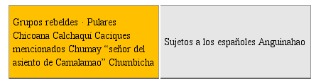 Desde allí la hueste sigue el río hasta dar con la fortaleza de Anguinahao donde se produce un enfrentamiento con sus pobladores. Debido a su derrota establecen un acuerdo por el que aceptan servir al español[24]. Habiendo apresado a su cacique, de nombre Chumay casado con una hija de Calchaquí, Abreu decide instalar un fuerte para asentarse en el valle en el asiento de Camalamao por ser “el mas comodo y aparejado del valle por estar junto a la fuerza de los naturales de un cabo calchaquí chumbicha y otros y chicuanapulares[25]. A través de los nombres de grupos y caciques mencionados en la cita, observamos la conformación del siguiente entramado rebelde que volcamos en el gráfico 1.