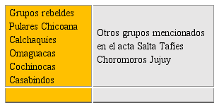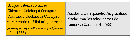 Entre los rebeldes enfrentados al gobernador Mercado se mencionan de forma constante a los pulares y calchaquíes. En otros casos, se enumeran con más detalle los componentes de la alianza. Otro testimonio describe la red del área de Jujuy en la que se mencionan grupos previamente nombrados como aliados de los pulares “Jujuy, sitiada por los indios omaguacas, casavindos, cochimocas, ocloyas, tilianes, viltipocos y otras naciones”[38].