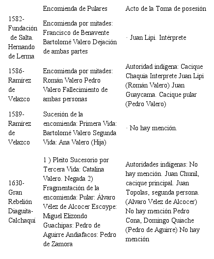 Con la muerte de la beneficiaria en segunda vida, Ana Valero sin dejar sucesor, el Gobernador Felipe de Albornoz en 1630 declara vacante la encomienda de los pulares y entrega los pueblos que, se afirmaba, habían integrado su encomienda: pulares, escoype y guachipas. Sus beneficiarios fueron los protagonistas de nuestro expediente enfrentados a Catalina Valero: Álvaro Vélez de Alcocer, Miguel Elizondo y Pedro de Aguirre respectivamente, sin embargo, los beneficiarios omitieron declarar que habían recibido estas encomiendas como resultado de las dejaciones y fragmentaciones anteriores[53].