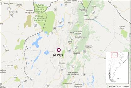Ubicada en el departamento de Cachi, provincia de Salta, la localidad de La Paya, conocida también como Puerta de La Paya se caracteriza por ser un asentamiento conglomerado de momentos de Desarrollos Regionales (850-1470 DC) con construcciones incaicas posteriores (1470-1536 DC). Se localiza sobre una extensa terraza en la margen derecha del río Calchaquí y frente a la desembocadura de la Quebrada de La Paya (Figuras 1 y 2). Presenta una superficie aproximada de 6 hectáreas, una muralla de circunvalación de pircado doble, recintos de paredes de piedra rectangulares adosados, cistas subcirculares y vías de circulación interna.
