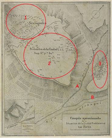Las tumbas de La Paya no están agrupadas en un único conjunto. Se distinguen tres grandes sectores de entierros: dentro del perímetro de la ciudad, en la “necrópolis” fuera de ésta y los que se hallan en la margen opuesta al río La Paya (en adelante, también “Banda”) (Figura 2). La mayoría de las tumbas de adultos se encuentran en la Necrópolis (71 tumbas[51]), apareciendo dentro de la Ciudad 61 y sólo 29 del otro lado del río. Las tumbas individuales por cada uno de los tres sectores son: 13, 25 y 8 respectivamente, ascendiendo su total a 46. Ambrosetti[52]destaca que la distribución de los objetos no es uniforme y comparó las diferencias de aparición entre los dos primeros conjuntos en tanto el último fue menos investigado durante los trabajos de campo.