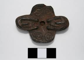 Son delgados objetos de bronce con forma rectangular en la mayoría de los casos y agujeros de suspensión (Figura 6) y cuya función sería ornamental. De entre los objetos de metal, son los más comunes en los sepulcros[84] y son más frecuentes en la Ciudad[85] (Tabla 2). Por tal motivo “esto nos probaría indirectamente que en la ciudad se enterraron en proporción más hombres que mujeres”[86]. Una vez más, no hay una explicación entre la asociación entre placas pectorales y los quehaceres masculinos.