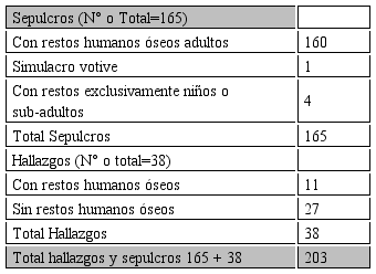 Ambrosetti[46] divide los contextos de los restos materiales, que totalizan 203, en dos tipos: sepulcros y hallazgos (Tabla 1). Los primeros son entierros simples y múltiples (de 2 hasta 20 individuos) en cistas de paredes de piedra. Pueden o no tener restos esqueletales humanos, ya que en ocasiones se presentan saqueados o en muy mal estado de conservación. Ambrosetti asume que los tuvieron en el pasado. Algunos sepulcros poseen exclusivamente niños o sub-adultos. Los hallazgos son contextos diversos, que incluyen inhumaciones de niños en urnas, urnas sin restos humanos (aunque considera que quizá no se hayan preservado), “falsas tumbas”, a modo de escondrijo, depósito de maíz o simulacro votivo. Veintisiete no poseen restos humanos, a diferencia de los once restantes. Uno de ellos, no obstante, es una tumba individual de adulto[47], lo que hace que los sepulcros de adultos sumen 161 (y que altera el resultado de la tabla 1, que es de 160), total que será aquí contemplado para este estudio.