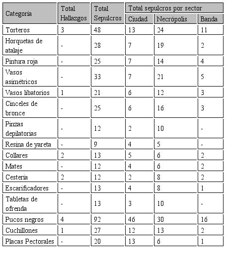 Se distribuye en los tres sectores de entierros (Tabla 2) y se encuentra en ocho sepulcros individuales, cuatro considerados de mujer (Tabla 3).