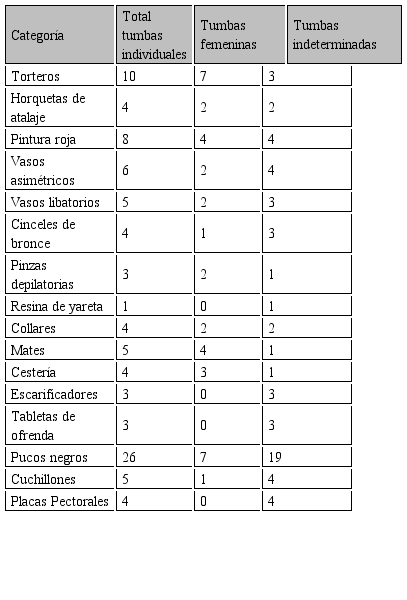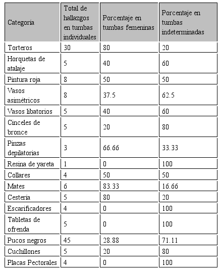 Las tabla 4 muestra el porcentaje de la presencia de cada categoría en las tumbas individuales. Hay una importante congruencia de los dichos de Ambrosetti en la distribución de ciertos artefactos asociados a mujeres: hay mayor predominio de torteros, pinzas depilatorias, cestos y mates. Sin embargo, los escarificadores, tabletas de ofrenda y la resina no se asocian a tumbas individuales de mujeres. Horquetas, pintura roja y collares, vasos asimétricos, vasos libatorios ocupan una posición intermedia. Por último, las categorías exclusivamente masculinas están levemente representados en las tumbas asignadas a mujeres.