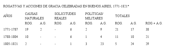 Más allá de la gravedad del caso reseñado, las rogaciones públicas por la inminencia de calamidades no constituyeron una excepción del Buenos Aires tardocolonial. Por el contrario, eran frecuentes en todas las ciudades del reino. Si una de las funciones de la religión era -y es- aliviar las angustias colectivas, debía contarse con mecanismos aptos para liberar las "fuerzas emotivas" que hacían sentir a las comunidades a "salvo del mal"[5].