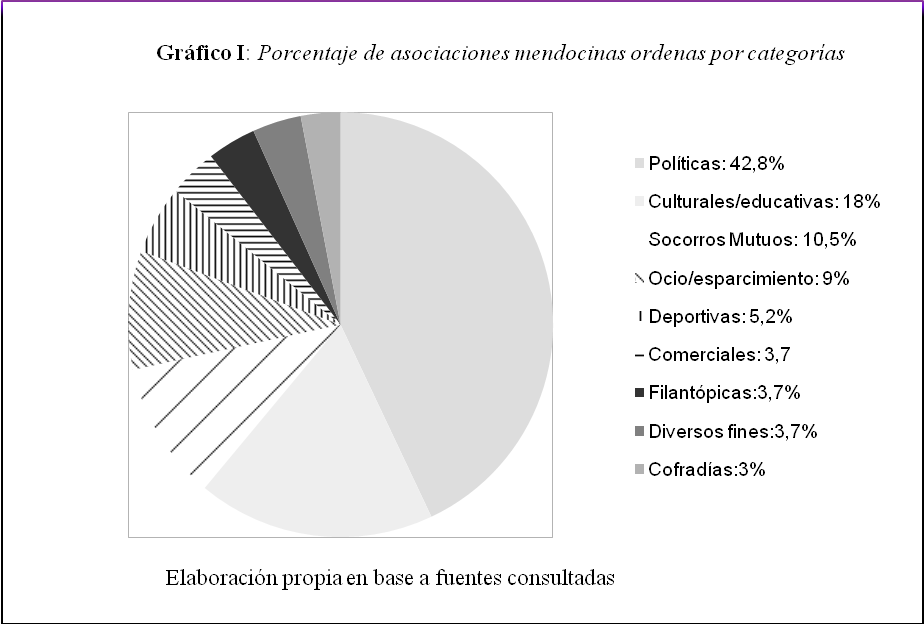 A partir de dicha clasificación se agruparon las entidades localizadas en el Gráfico I, el cual ilustra la preponderancia que tuvieron las asociaciones con fines políticos: en total se registraron 57 clubes (42,8%). Por su parte se visualizan 24 (18%) asociaciones con fines culturales y educativos; 14 (10,5%) asociaciones de Socorros Mutuos; 12 (9%) asociaciones con fines de ocio y esparcimiento; 5 (3,7%) asociaciones comerciales y 5 (3,7%) filantrópicas; 7 (5,2%) asociaciones deportivas; 5 (3,7%) asociaciones con fines diversos y 4 (3%) cofradías.
