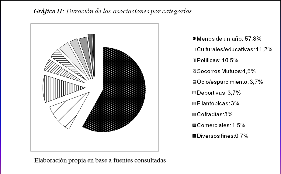 Otro rasgo que se distingue a partir de la organización de la información es el carácter efímero e inestable de la mayoría de las experiencias registradas. De acuerdo a los porcentajes presentados en el Gráfico IIen total 56 asociaciones (42,1%) tuvieron actividades durante un año o más, de las cuales: 14 eran políticas, 15 culturales y educativas, 6 sociedad de socorro mutuo, 5 de ocio y esparcimiento, 4 filantrópicas, 4 cofradías, 5 deportivas; 2 comerciales y 1 categorizada dentro del grupo de otras asociaciones. Las restantes 77 asociaciones (57,8%) desaparecieron antes del año de vida o bien porque cumplieron los objetivos para los cuales fueron creadas –como en el caso de 43 asociaciones políticas que luego de las respectivas elecciones fueron disueltas–; o bien porque no contaron con la participación y compromiso de sus miembros y del resto de la sociedad mendocina, esto ha sido detectado sobre todo en asociaciones culturales/educativas y de ocio/ esparcimiento[29]. Del resto de las asociaciones agrupadas como efímeras no se ha localizado ningún registro sobre sus actividades, actas o miembros por lo que se infiere que desaparecieron poco después de su creación.
