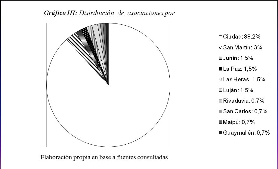 Asimismo las prácticas asociativas desarrolladas en los departamentos se distribuyeron de la siguiente manera: 8 clubes electorales y 6 sociedad con fines culturales/educativos dispersas en: San Martín, San Carlos, Junín, Las Heras y La Paz; y 3 de ocio/esparcimiento ubicadas en San Martín, Rivadavia y Maipú. (Ver:Gráfico III/Mapa I). Respecto a los clubes electorales localizados corroboran que la ciudad no fue el único centro en dónde se dirimió la política, el ámbito rural jugó un papel fundamental. Conforme a la información reunida, sobre todo a partir de la década de 1870, existen registros de que los clubes instalados en la ciudad formaban “comisiones electorales o departamentales” que por lo general se encargaban de emplazar clubes que funcionaban como “células” de los establecidos en la capital provincial a fin de movilizar las voluntades de individuos y grupos en la arena política.