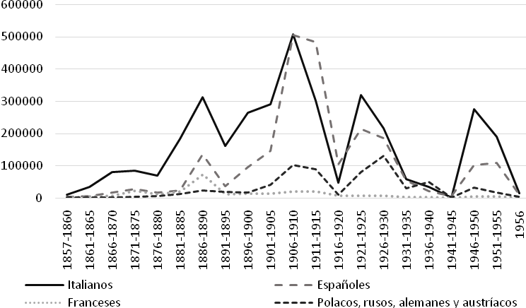 La migración francesa, como estudia Hernán Otero[31], no fue investigada sistemáticamente como otros flujos, aunque Francia constituyó una referencia constante como modelo cultural e intelectual en el paradigma de la Generación del 80. Si bien durante el período colonial ya migraban, su presencia se torna significativa a partir de 1830. Los factores de expulsión no difieren demasiado de los daneses, irlandeses o alemanes: la pequeña propiedad rural resultaba insuficiente, el encarecimiento del precio de la tierra, el aumento de los impuestos, junto con el sistema de herencia, especialmente en regiones de sur disminuyeron las posibilidades de progreso, en un contexto dinamizado por la Revolución Industrial, que llevaron a los jóvenes a probar suerte en otros territorios. Pero además de estos factores, los franceses constituyeron una migración policlasista insertándose en todas las actividades económicas del país: una emigración clásica de la época, trabajo en una empresa (con una presencia muy significativa en lo comercial, aunque menor que la británica), exilio, espíritu de aventura u actividades del mundo académico. Poseían una predominancia masculina y una inserción preferencial en la ciudad de Buenos Aires.