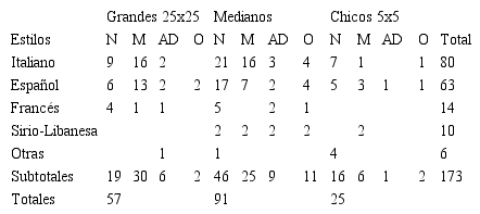 La categorización por estilo arquitectónico, en un marco de un importante eclecticismo se constituye como una línea a considerar sobre todo en los que tuvieron una clara intención purista, como es el caso de los construidos por asociaciones poderosas. El estilo neoclásico, elegido mayoritariamente no resulta disruptivo sino, por el contrario, no resalta como otros de la misma época para familias poderosas que revisten una grandilocuencia fastuosa. Por el contrario, la línea general es ciertamente discreta. Sólo los góticos resaltan por sus detalles propios, siendo españoles en su mayoría e italianos los que optan por un art decó.