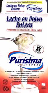 La leche en polvo entregada por el programa -como muestran las Ilustraciones 1, 2 y 3- venía presentada en una caja de color blanco y -en la parte inferior- rojo, de 23 cm de alto, por 14 cm de ancho y 6,5 cm de espesor. Las imágenes y la información inscriptas en el frente y en dorso de la caja eran las mismas: en el centro figuraba grande y en azul la marca comercial “PURÍSIMA LÁCTEOS” y, a un costado “rinde 8 litros”; más arriba se leía en azul “leche en polvo entera” y, en rojo y subrayado, “fortificada con vitamina C, hierro y zinc” (estas inscripciones están también en la parte de arriba de la caja). Abajo del nombre comercial, estaba escrito en negro “Gobierno de la Ciudad Autónoma de Buenos Aires. Ministerio de Salud. Dirección de Programas Especiales. Departamento Materno Infanto Juvenil. Programa de Apoyo Nutricional. Prohibida su Venta o Comercialización”. Más abajo a la izquierda había un círculo que indicaba que el producto era “libre de gluten”, “sin T.A.C.C.” y el “Peso Neto 1000g”. En el ángulo de abajo a la derecha decía Industria Argentina y el ícono de la bandera correspondiente. Como imagen de fondo estaba la foto de una cuchara inclinada versando leche en polvo (arriba de la inscripción de la marca comercial) y, a la altura del logo de la empresa, el polvo se transformaba en leche líquida que terminaba de caer en un vaso con leche.