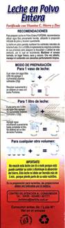 Respecto del modo de preparación, allí se explica –recurriendo a frases y a imágenes- para obtener un vaso de leche, un litro y para cualquier otro volumen. Según se indica, para un vaso, verter agua tibia (200 ml) y agregar dos cucharadas soperas colmadas de leche en polvo (25g) y revolver suavemente. Para un litro de leche se debía utilizar medio litro de agua tibia y agregar 10 cucharadas (125 g) luego, revolviendo, agregar otro medio litro de agua. Debajo de estas indicaciones llamaba la atención un cartel amarillo que decía:
