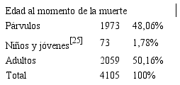 Aunque no es nuestro objetivo realizar un análisis demográfico de la parroquia ni profundizar en su composición étnica, consideramos necesario tener en cuenta algunos datos generales concernientes a la población estudiada. El análisis por sexo arroja un leve desbalance en favor de los hombres (52,62% contra 47,38%); tendencia que ya ha sido registrada en estudios similares[22]. Por otro lado, al igual que en el resto de la ciudad y en concordancia con los índices de mortalidad de la época, se registra una alta proporción de párvulos (48%) con respecto al total de fallecidos[23].