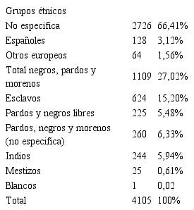 En cuanto a la composición étnica de los habitantes, los datos recabados corroboran las descripciones tradicionales de la zona. El 66,41% de las partidas no especifican etnia. La categoría de blanco sólo se utilizó en una oportunidad a lo largo de todo el libro, mientras que la de mestizo comenzó a emplearse sólo durante los últimos años y en una proporción muy reducida. Por tanto, estimamos que la amplia mayoría de quienes no aparecen identificados está compuesta por blancos y mestizos, algunos de éstos registrados con el apelativo “Don”. Dentro de este grupo también encontramos 129 españoles peninsulares (3,14% del total) y 63 europeos no españoles (1,54%), en su mayoría portugueses[26]. El segundo grupo en importancia eran los negros, pardos y morenos, con el 27%. Este último grupo estaba compuesto en su mayoría por esclavos (15,20%) y en menor medida por negros libres. También se registraron 244 indios, lo que equivale a un 6% de la feligresía.