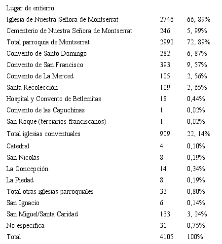 De nuestro análisis se desprenden algunos datos que consideramos particularmente relevantes. En primer término, sobresale el alto porcentaje de entierros en la propia parroquia. Esta preeminencia de la iglesia parroquial como lugar de inhumación nos permite matizar la centralidad tradicionalmente atribuida a las órdenes regulares y recuperar el rol central desempeñado por el clero secular en el momento de la muerte, especialmente entre los sectores más pobres de la ciudad. En contrapartida, los regulares adquieren un papel preponderante en la medida en que nos restringimos a los sectores de mayores recursos. Las causas que motivaban la elección del lugar de entierro también variaban y daban cuenta de la amplia gama de factores que influían al momento de decidir el destino final del cuerpo: la pertenencia a una cofradía u orden tercera, las restricciones económicas o la devoción del difunto a un santo o una advocación de la Virgen.