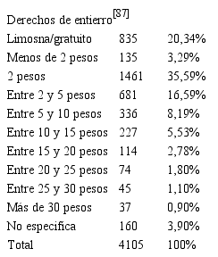 En la parroquia de Montserrat, más del 20% de los entierros fue realizado de limosna. Aunque casi el 80% pagó algún tipo de arancel, dentro de éstos el grupo más numeroso (35,59%) era el de quienes sufragaban el mínimo de 2 pesos (sin contar el peso extra de misa rezada). Esto quiere decir que más de la mitad de los entierros (59,22%) fueron realizados de limosna o a cambio del arancel mínimo. A su vez, de los 4105 difuntos, solamente 37 (menos del 1%) pagaron montos superiores a los 30 pesos. Los funerales más costosos corresponden a dos hombres, Pedro Sánchez Calderón[88] y Pedro Leal[89], que eligieron ser enterrados en la parroquia con toda la pompa posible, y sufragaron 75 y 78 pesos respectivamente. En ambos casos se trataba de entierros mayores, con posas, misas de cuerpo presente y novenario. Este tipo de funerales, muy frecuentes en los conventos, eran más bien excepcionales en las parroquias de la periferia.