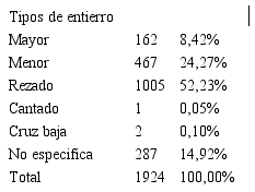 En cuanto al tipo de funeral celebrado, éstos se registraban bajo muchas denominaciones diferentes: mayor, menor, cantado, rezado, de cruz baja, de cruz alta, clásico, de primera clase, de segunda clase, etc. Aunque algunas de estas categorías pueden interpretarse como sinónimos, en otros casos se solapan o yuxtaponen, ya que aluden a diferentes aspectos de la ceremonia, como las características de la misa, o el tipo de cruz utilizada en el entierro. Por ejemplo, un entierro con cruz alta podía estar acompañado tanto de una misa cantada como rezada. Además, los funerales diferían según se tratase de un párvulo o de un adulto. No solamente se diferenciaban en cuanto al arancel (mucho menor en el caso de los primeros), sino también en las características de la ceremonia. Por ejemplo, a diferencia de los adultos, los entierros de párvulos siempre debían realizarse con cruz baja[96]. Para complejizar aún más el registro, también solía consignarse la presencia de ministros revestidos o “de sobrepelliz”, así como la cantidad de posas, si es que se realizaban.