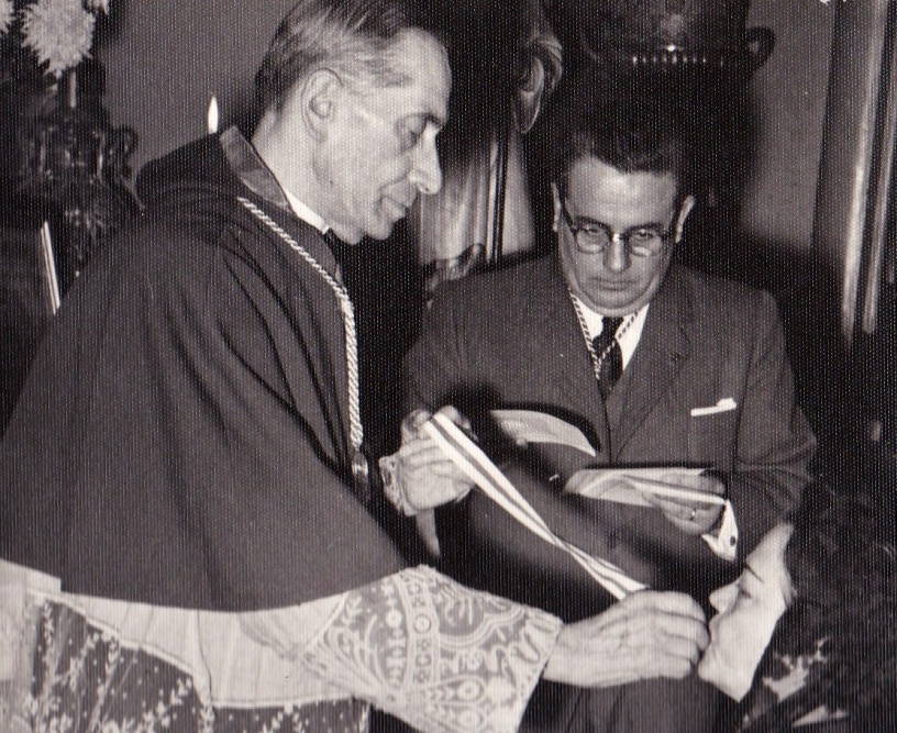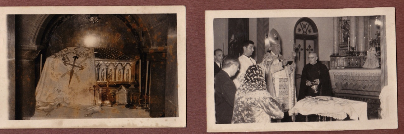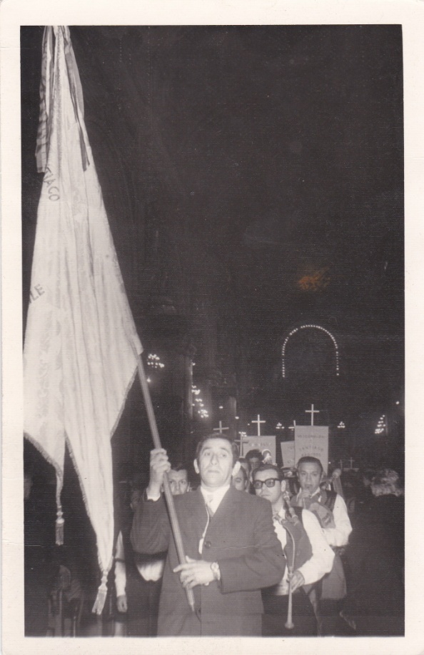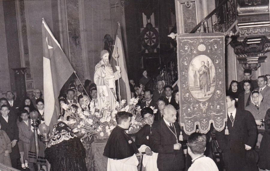 El nexo generado por la cofradía nació dado el interés particular por un culto que reestableciera los lazos con la Galicia natal y diera espacio a las inclinaciones religiosas de los fieles gallegos y cercanos a estos. Bajo esta perspectiva, la Cofradía de Santiago Apóstol en Chile nació como una representante o delegada de la Archicofradía de Santiago Apóstol establecida en Santiago de Compostela, bajo la dirección de un inmigrante gallego oriundo de dicha ciudad. Don Antonio Pérez fundó la cofradía en 1960 buscando aunar la devoción religiosa de un grupo de gallegos con sus raíces socioculturales bajo la figura mística del Apóstol Santiago y de Santiago de Compostela. Tras conseguir un estandarte de la cofradía (ver figura 1) y regresar a Chile, comenzó junto a su esposa a reclutar cófrades entre los comensales gallegos y españoles que acudían a su famoso Restaurant La Bahía en el centro capitalino y a través de las redes de parentesco. Según José Domínguez Diéguez, sucesor de Don Antonio y último presidente de la cofradía, quienes se acercaron e ingresaron a la institución eran en su mayoría descendientes de inmigrantes gallegos que arribaron en oleadas a Chile entre fines del siglo XIX e inicios del siglo XX[11]. Les atraía el poder celebrar a un santo patrono en común y la oportunidad de mostrar frente a la sociedad capitalina sus bailes y costumbres. La figura tutelar de Santiago Apóstol hacía las veces de lazo toponímico cultural y religioso[12]. Así, según muestran las fotografías de época, los iniciados primero ingresaban a la cofradía bajo la categoría de Hermano Menor mediante una celebración realizada en la Catedral de Santiago, para luego escalar hacia la imposición de la medalla de Hermano Mayor tras probar su compromiso religioso (ver figuras 2 y 3). Se estableció así un ancla simbólica para estos gallegos que cristalizó una serie de imágenes y creencias bajo prácticas religiosas comunes teñidas de nostalgia y necesidad de reencuentro entre tierras distantes.